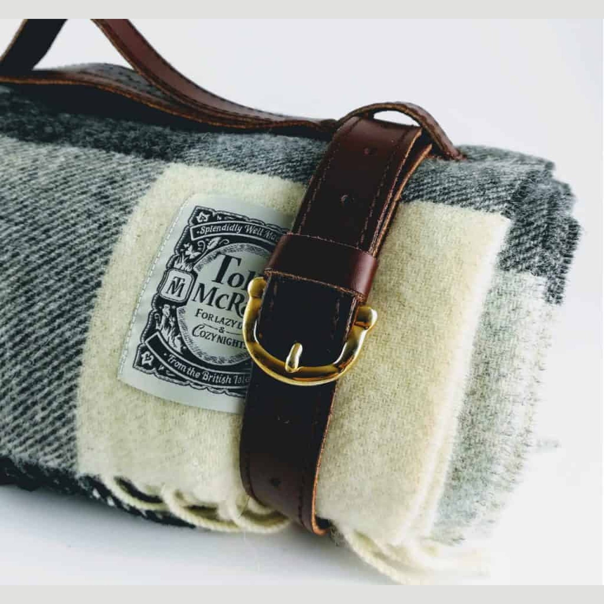 Summer and winter can seem black and white in Britain, with blistering heat (occasionally) and arctic conditions (sometimes). So, what better desirable object to arm yourself with than a Tolly McRae Black & White Picnic Blanket. Which doubles as a luxury blanket when it gets cold outside. It comes with a fine leather strap that is made in Walsall, which elegantly folds it neatly to carry. Not everything is black and white but this Tolly McRae Black & White Picnic Blanket is.