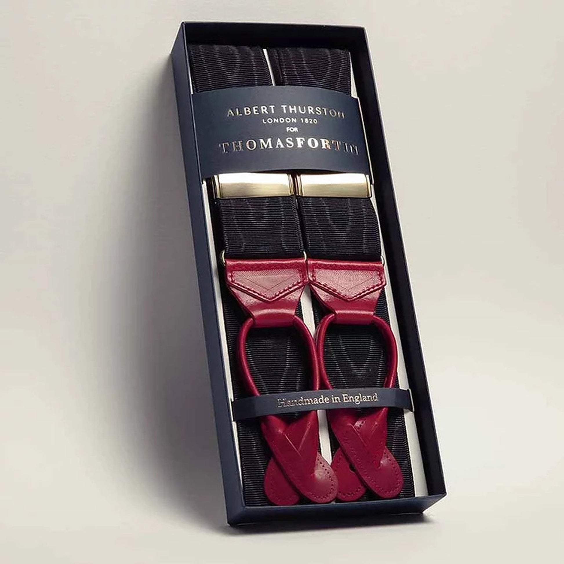 Thomas Fortin has collaborated with world-renowned braces maker Albert Thurston to produce these beautiful handmade black moire braces with red leather runner ends. Albert Thurston, credited with inventing the modern form of braces, began making them in Haymarket, London in 1820 and celebrated their 200th anniversary year in 2020. Together with Thomas Fortin they have designed these standout pair to complement and enhance any suited ensemble. Black men's braces add real class to an evening outfit ready for a Black Tie event. Moire braces are made from 50% cotton/50% nylon and woven in England. The leather runner ends use 100% bovine leather from Italy for a refined and beautiful finish. Made in Leicester