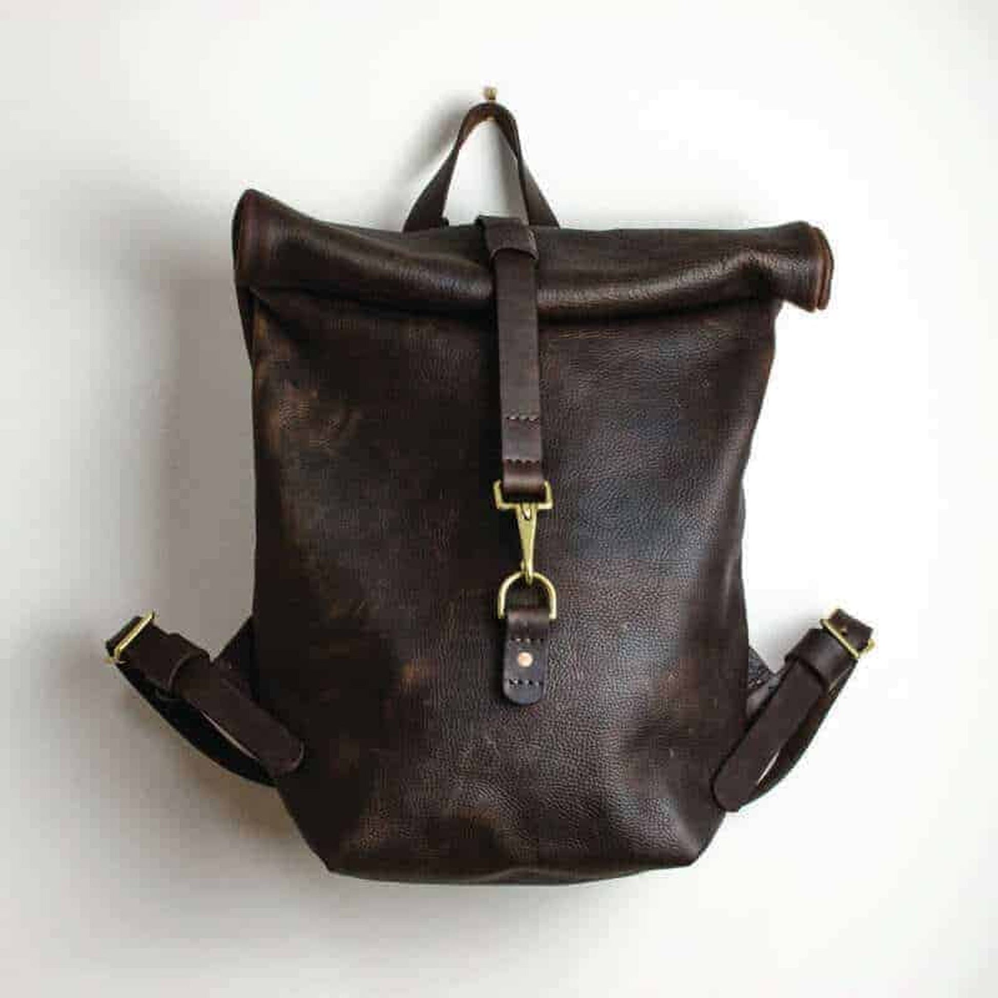 The medium size Kodiak Leather Roll Top Backpack. Designed for daily use and great for taking on walks across hill or vale. Or simply a commuter bag or work bag.
