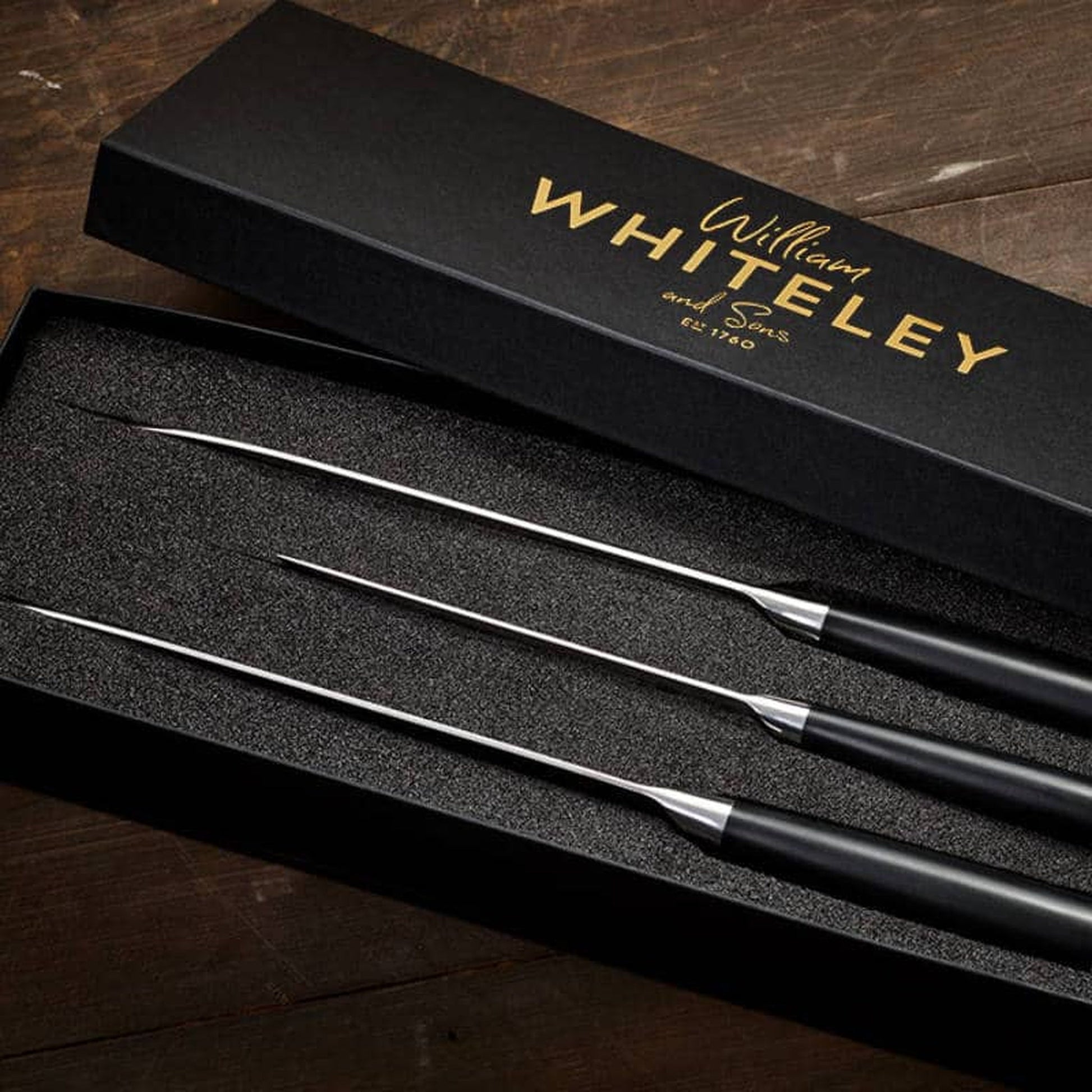 Each knife set will arrive in a Signature Whiteley Presentation box with bespoke foam.