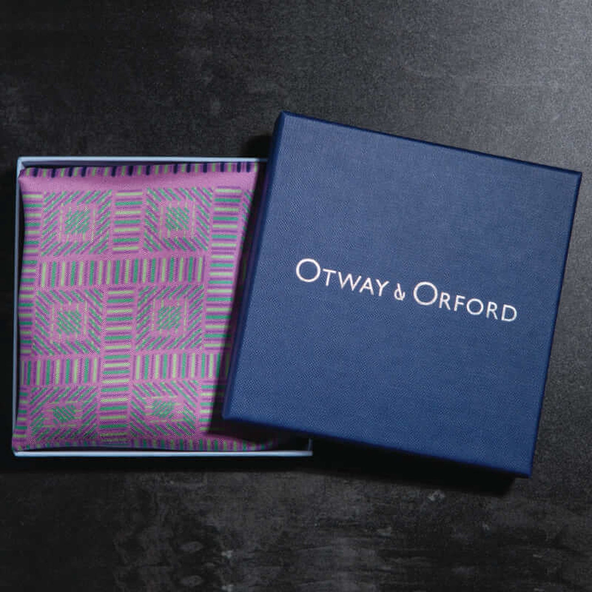 'City Squares' is presented in a complimentary Otway & Orford branded gift box with its blueberry-coloured lid and pale blue base. Inside each box, the high-quality silk pocket square comes tissue-wrapped.