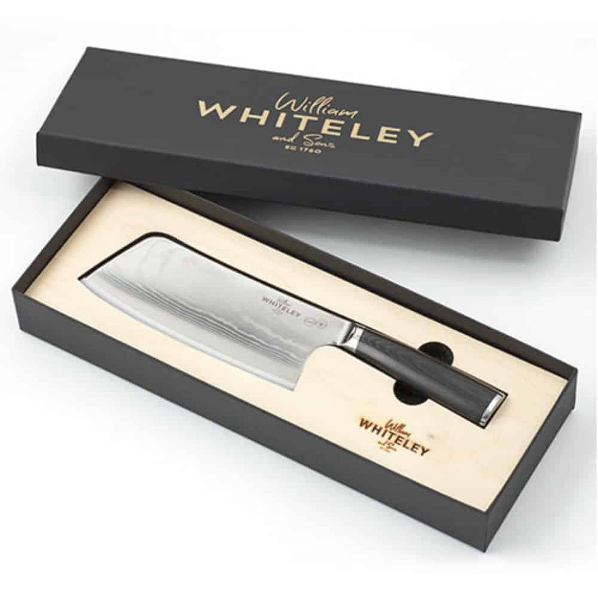 The multi-layered Damascus steel blade provides an ultra strong core. Coupled with flexible stainless steel allowing the edge to be honed to razor sharp precision. This in turn provides superior edge retention. The ergonomic G10 resin infused handle not only provides a striking design. But also aids the Whiteley Damascus cleaver knife's precision balanced handle and blade. As the Damascus blade is built up of many sandwiched layers covering the core of the blade, each British Made Chef's Cleaver is completely unique making it the perfect gift. And comes in black presentation box.