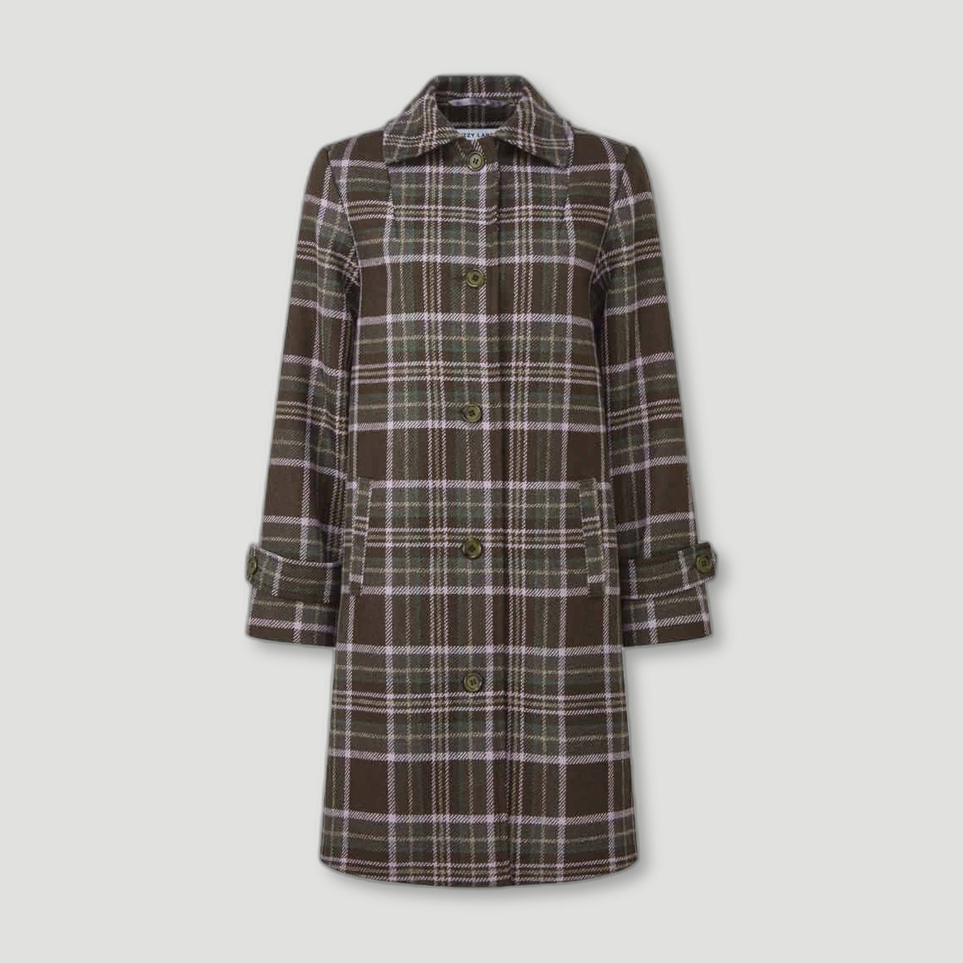 The Denholme Coat in Moorland Peat is a versatile, single-breasted coat in Carnaby Tan tartan with button cuff details and back pleated vent. Side and inside pockets. Fully lined Woven in an ancient woollen mill in the Scottish Borders from the wool of the Izzy Lane Shetland rescued flock. Length 96cms Designed by Lily Guinness Sizes: X Small - Bust 32.5"/82.5 cm Waist 26.5"/67cm Hips 34"/87cm Small - Bust 34.5"/87.5cm Waist 28"/71cm Hips 36"/92.5cm Medium - Bust 36"/94cm Waist 30"/77cm Hips 38.5"/98.5cm Large - Bust 39"/99cm Waist 32"/82cm Hips 41"/104.5cm X-Large - Bust 41"/104cm Waist 34"/87cm Hips 43.5"/110.5cm