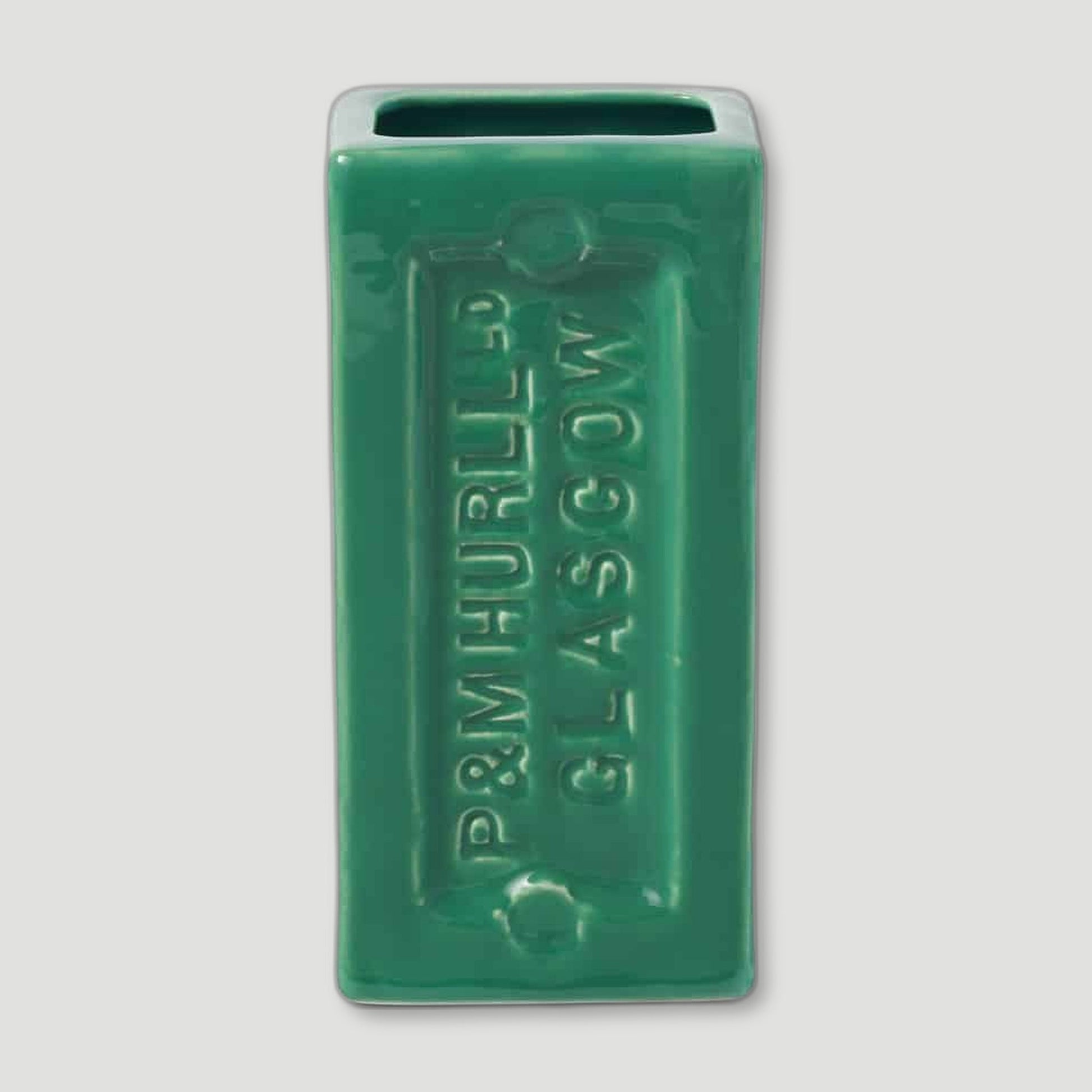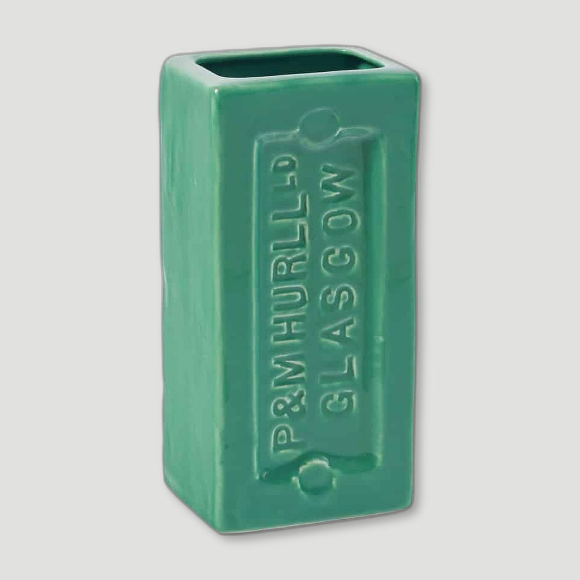 Glasgow's iconic brick reimagined in glossy green Stoke-on-Trent earthenware. Perfect for Scottish pride and industrial design appreciation in watertight versatility.