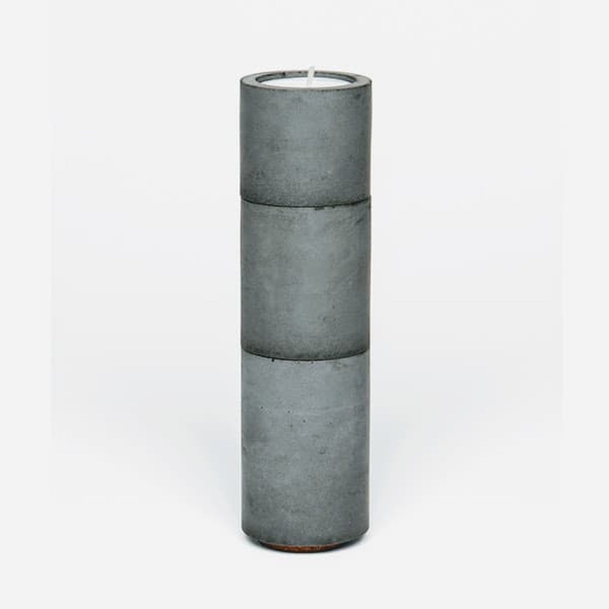 Make a statement with these hand poured, concrete grey tea light holders. They make a wonderful centrepiece on a coffee table or side table. They have been purposely designed with a sustainable cork base so they look like they are floating on the surface. The cork base also means they can fit into the unique Concrete & Wax modular system. This clever system means that you can create a whole host of different stacks of candles and holders from any of the Concrete & Wax range. Standard sized tea lights fit into them perfectly for that welcoming glow on an evening that only a candle can offer. Each concrete holder is individually poured to create a unique and individual piece that gives each one its own character. Modern, minimalist yet soulful. Delivered with a set of 3 soy wax tealights in your selected fragrance. Handcrafted in Suffolk