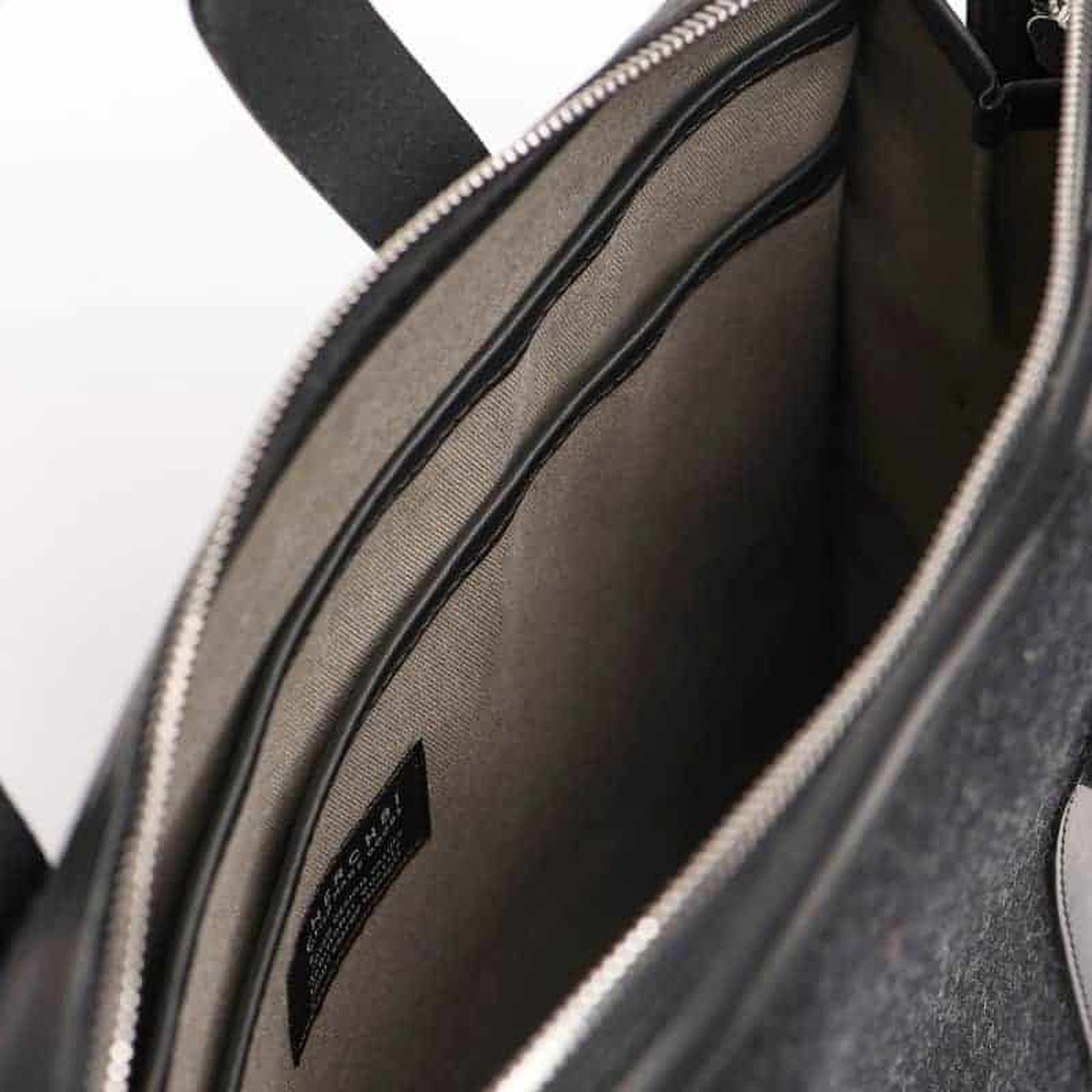 The Cherchbi Isambard Briefcase in Bandolier Black is a handcrafted briefcase. Designed to be paradoxically both smart and casual at the same time. A water resistant wool briefcase makes a real statement. Expertly bench made utilising traditional leather working techniques to create a black briefcase that will last a lifetime. Intentionally designed to be low on the waist. Its construction, creates a robust and durable product. Using the finest Italian leather and heritage wool from AW Hainsworth. Coupled with premium Behrens 100% dyed cotton fabric in a warm grey hue and premium hardware, it makes the Isambard Briefcase in Bandolier Black a heirloom piece. Especially for those who are discerning when it comes to both style and sustainability.