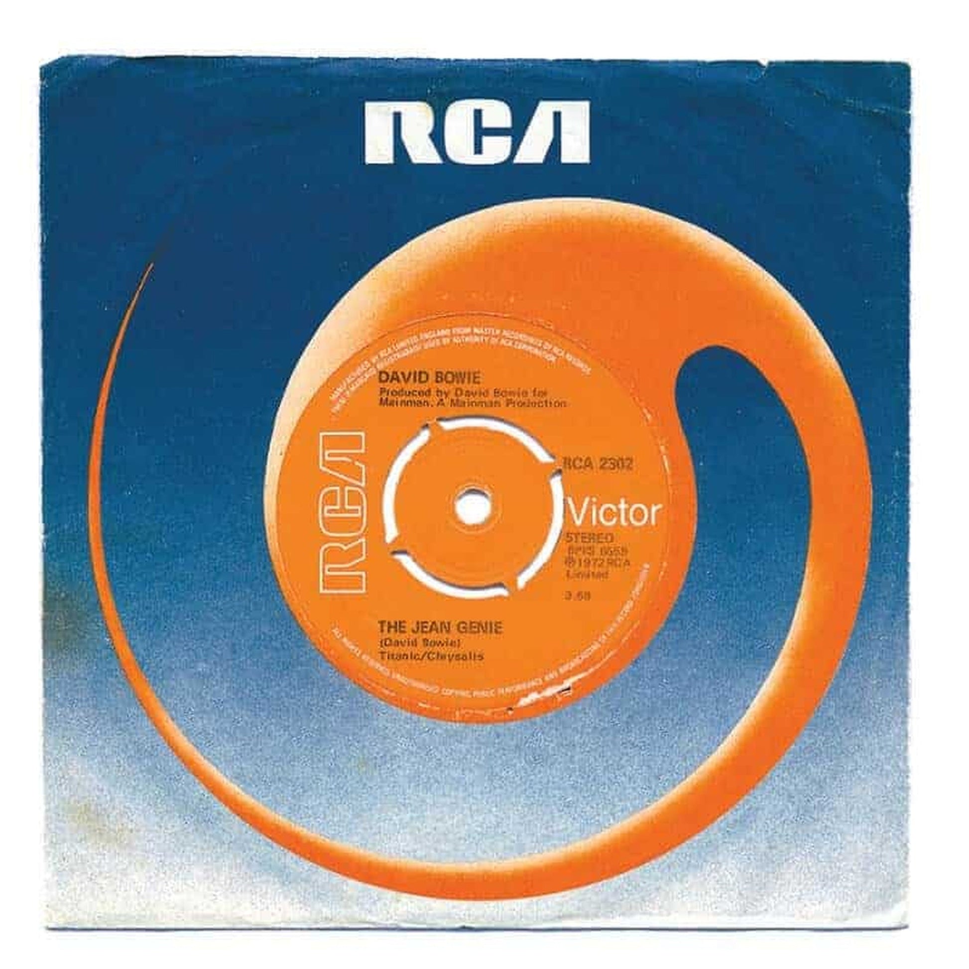 The Jean Genie Art Print. Large scale 57cm x 57cm (image size 46cm x 46cm) Giclée Print of an original image an original 7" Vinyl Single Record in a classic Seventies 'Blue and Orange Swirl' RCA sleeve. The original comes from a music lovers' own record collection, with all of the patina of years of love and use.