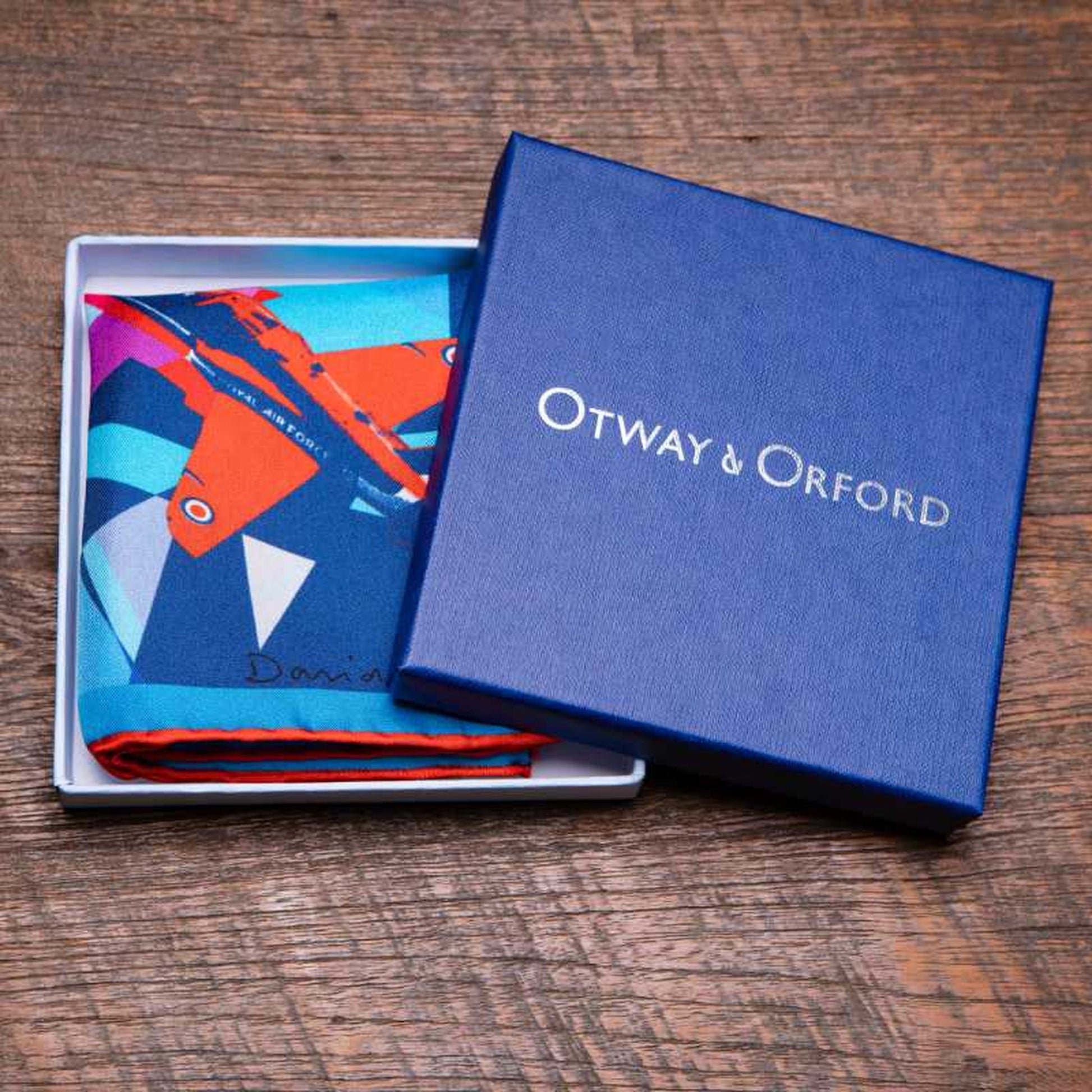 The work brings out the precision and beauty of display formation flying. David's geometric shapes, bold colours, authentic detail and Boy's Own bravado bring aviation and modern art together. A celebration of flight, 'Jubilee Diamond' is reproduced with a good balance of colour between the printed and reverse side of the silk pocket square, which works perfectly with any pocket square fold. The artwork is framed by the pocket square's blue border and red hand-finished hem. The 'Jubilee Diamond' silk pocket square makes an ideal gift for men who are thrilled by the aerial acrobatics of jet aircraft and, like everyone, admirers of the Red Arrows. Inside each high-quality Otway & Orford branded gift box, the pocket square has been carefully wrapped in tissue. And is accompanied by a card telling the story of the artist and his artwork.