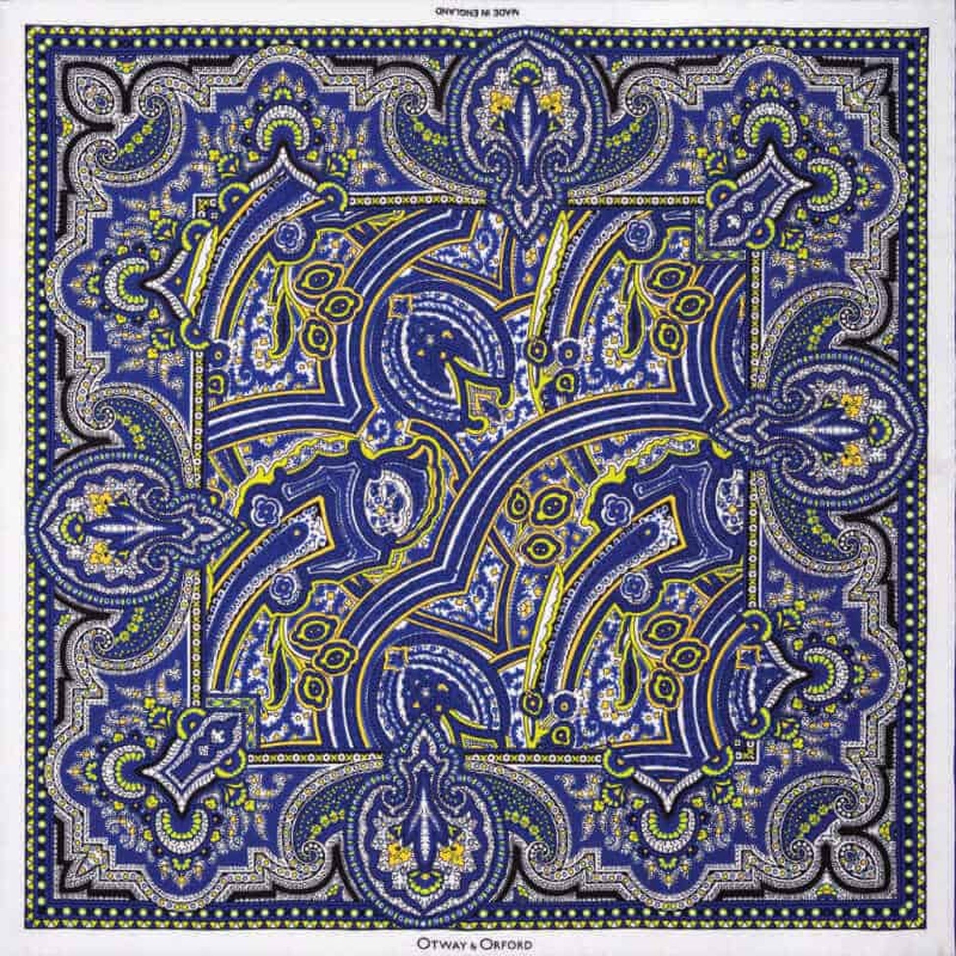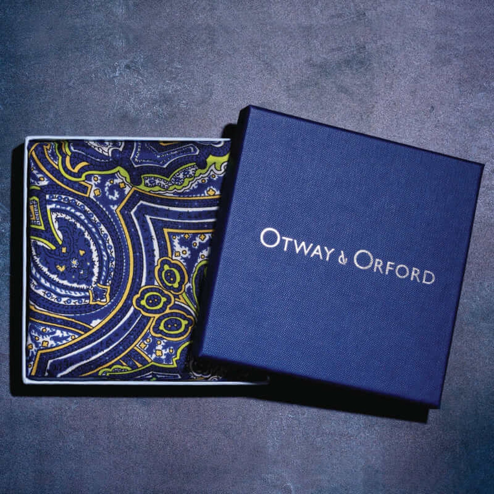'Labyrinth' is presented in a complimentary Otway & Orford branded gift box with its blueberry-coloured lid and pale blue base. Inside each box, the high-quality silk pocket square comes tissue-wrapped.