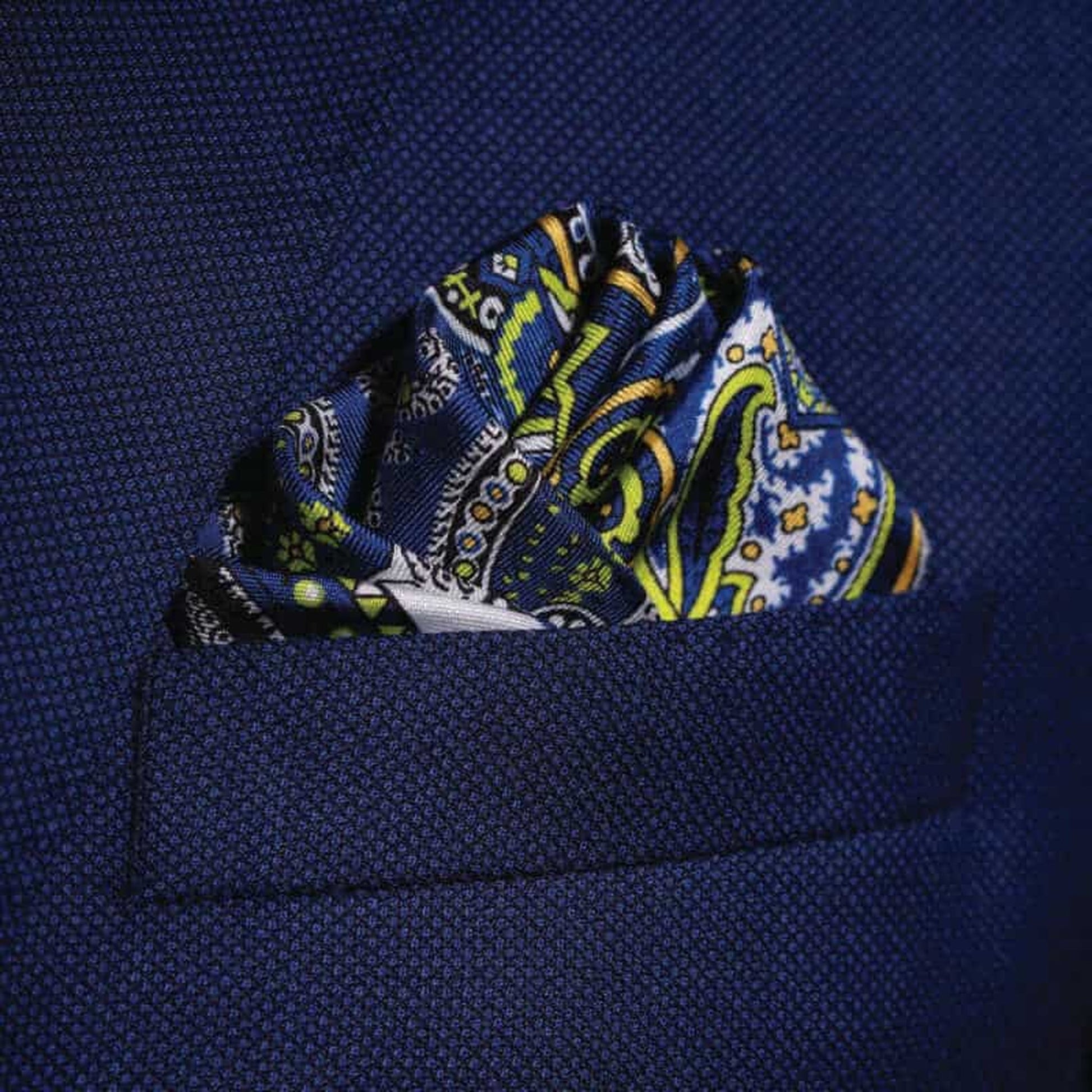 Labyrinth' is a stylish and unique silk pocket square with an intricate pattern in blue, white, & lime green and is finished with a hand-sewn hem. It is a fresh take on classic archive designs.