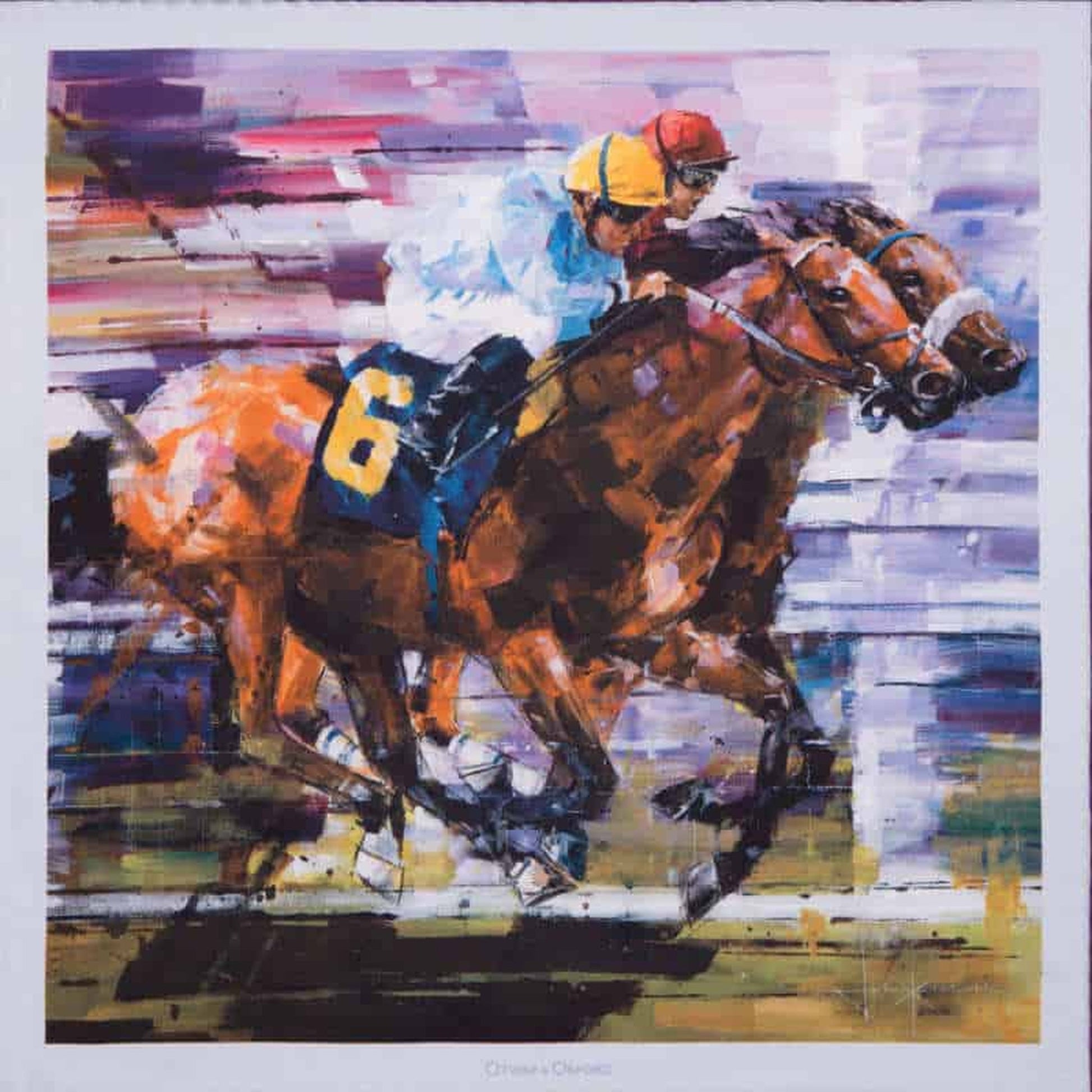 Neck And Neck' is inspired by modern-day horse racing and is a high quality, large-size silk horse racing pocket square with hand-rolled and hand-sewn hem. It is made in Macclesfield, the traditional home of English silk printing. It was created in collaboration with leading 'painter of speed' John Ketchell whose original artwork on canvas was inspired by the dynamism of contemporary racing and the striking colours of jockeys' silks. John's semi-abstract impressionist style captures speed and drama at the same time as delivering accuracy of reproduction, such that the subject seems to burst into life.