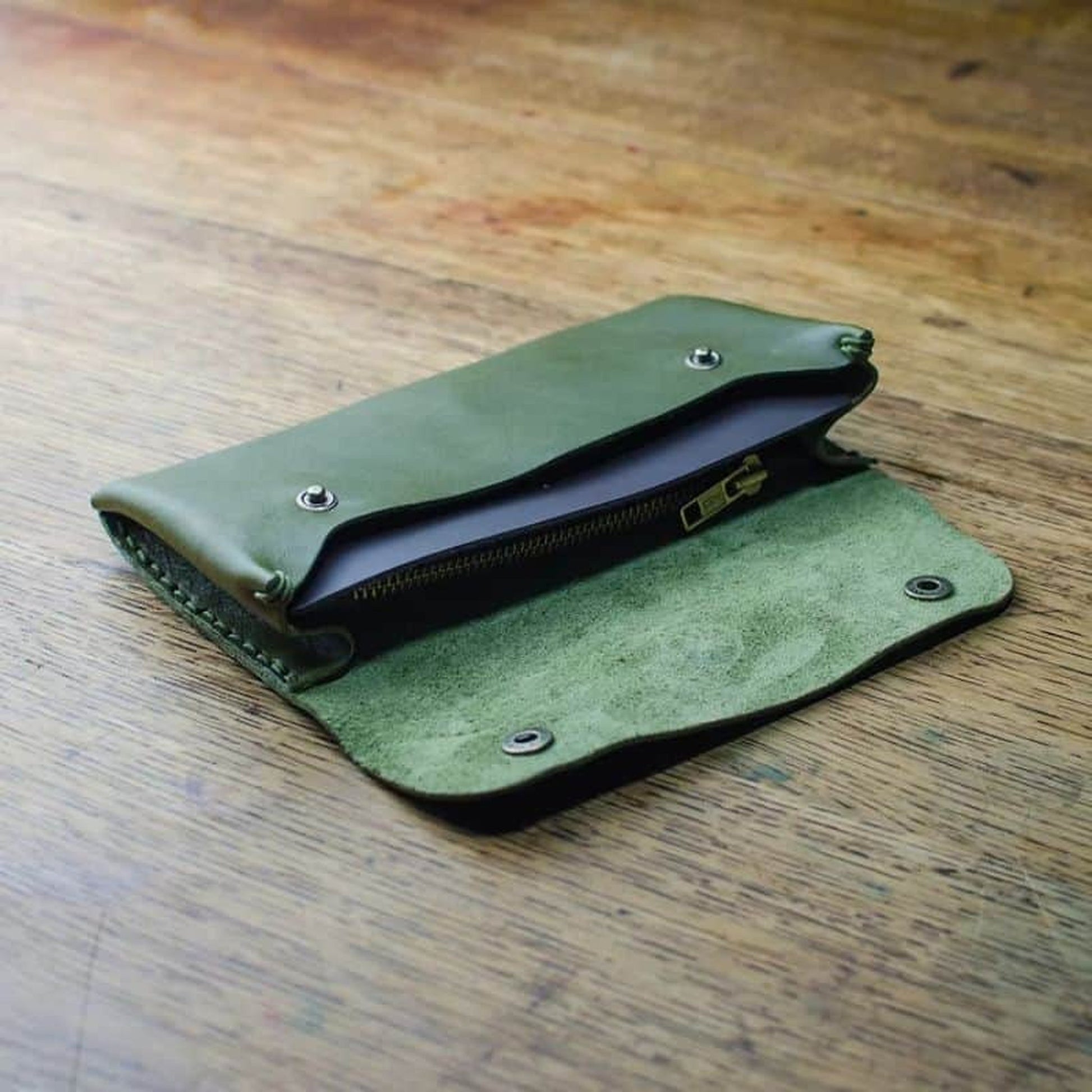 This olive green leather purse is made from full grain premium quality Italian leather which is both soft and durable, perfect for products that will be regularly used.