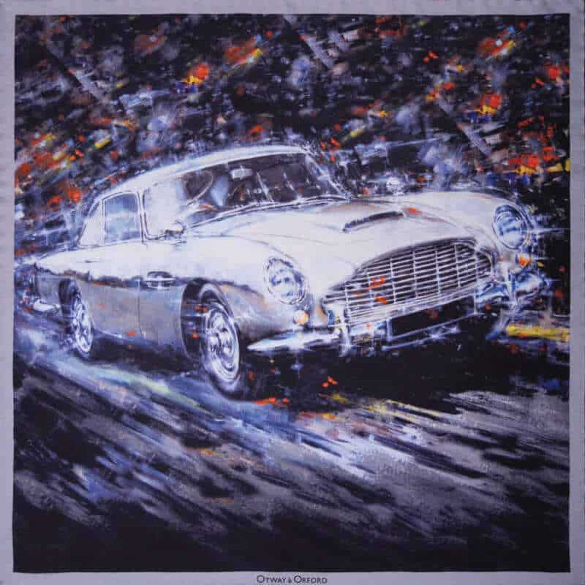 On a Mission' is a stylish and unique silk pocket square in grey & silver with hand-sewn hem, inspired by the company car of Britain's most famous fictional secret agent. It was created in collaboration with artist John Lawson and is presented in a complimentary gift box. His work hangs in. collections with some of the world's most iconic driving machines and his style of painting captures the true essence of these famous cars.
