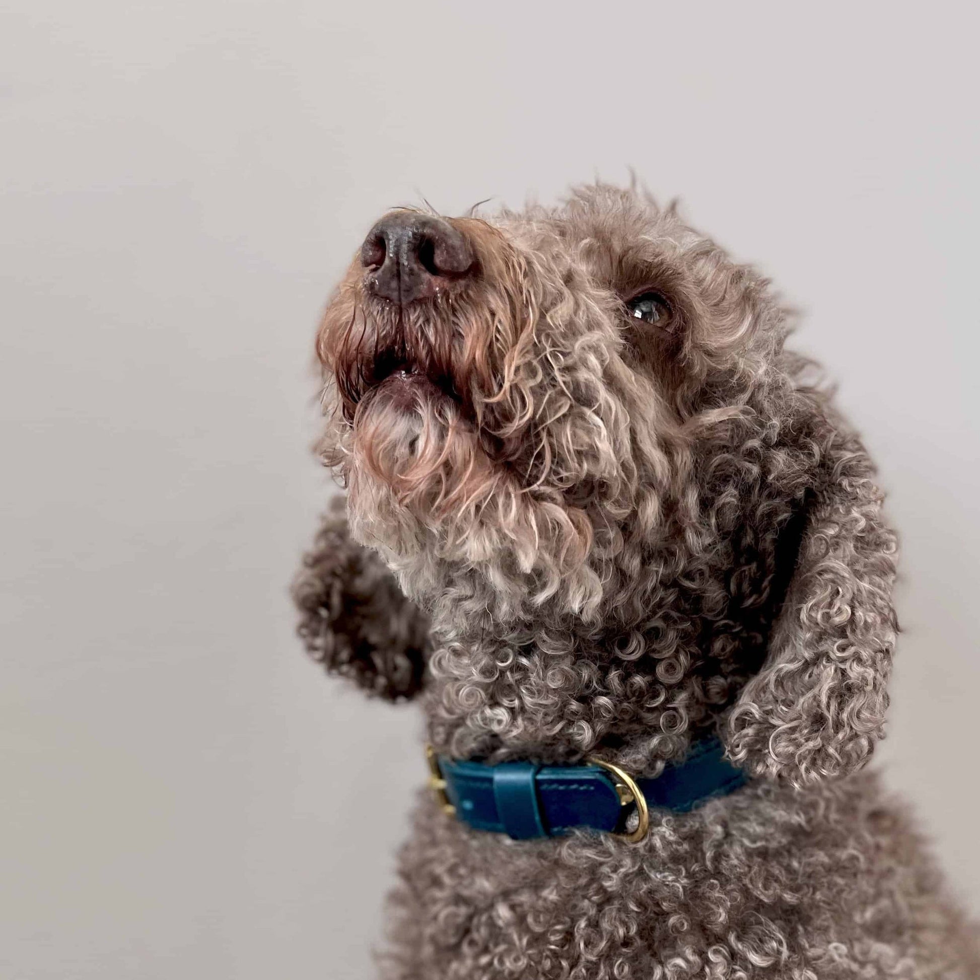 Peacock blue leather dog collar handcrafted from premium Italian leather with English brass fittings. A distinctive choice for dogs whose owners value chemical-free British craftsmanship.