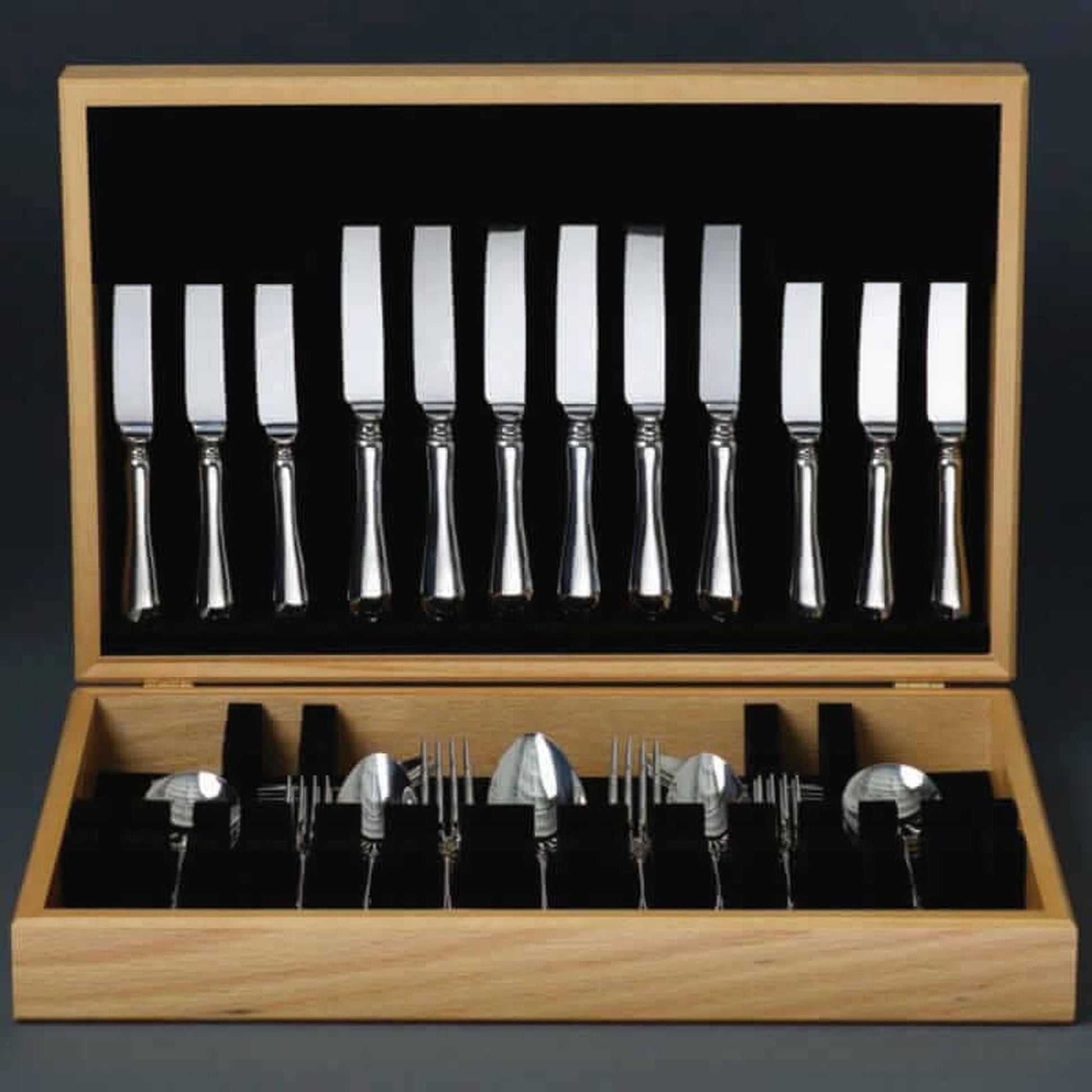 The 44 piece place setting comprises of 6 x Table Knife, 6 x Dessert Knife, 6 x Table Fork, 6 x Dessert Fork, 6 x Soup Spoon, 6 x Dessert Spoon and 6 x Tea Spoon and 2 x Table/Serving Spoons and is presented in a beautiful oak canteen box