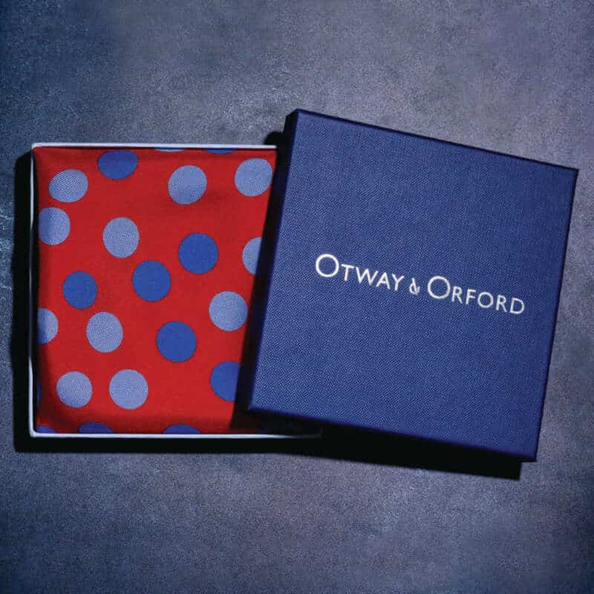 Planetarium silk pocket square in red and blue from Otway & Orford captures celestial beauty. Perfect for those who want cosmic elegance in British-designed silk.