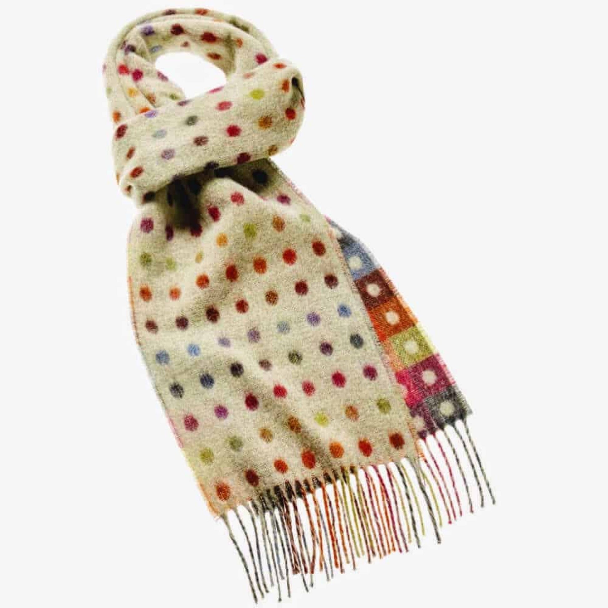 The sage multi-spot scarf from Bronte by Moon is a traditionally crafted scarf. Abraham Moon is one of the last vertical mills in Britain and have a global reputation for quality. Their sage multi-spot scarf is no exception. It is a modern scarf made from the finest 100% merino lambswool to keep you wrapped up warm with a soft touch.