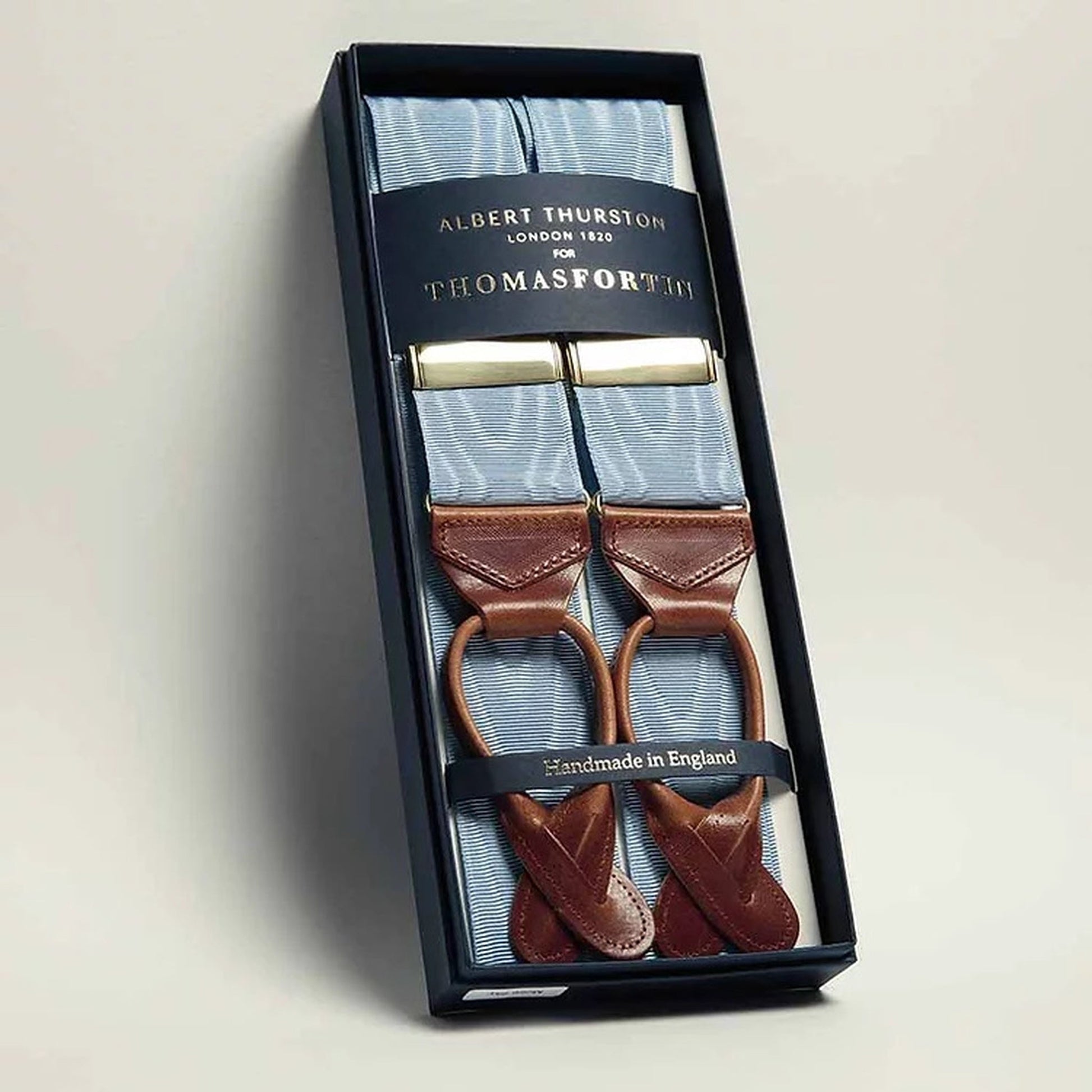 Thomas Fortin has collaborated with world-renowned braces maker Albert Thurston to produce these beautiful handmade sky blue moire braces with camel colour glazed leather runner ends.