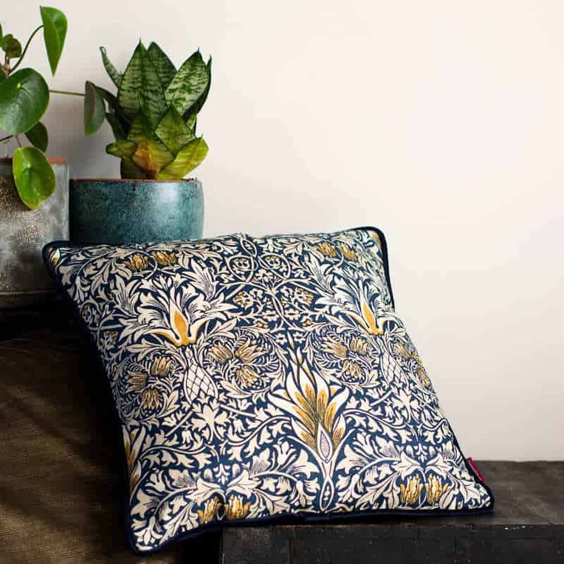 Add some old world charm yet maximal style to any room with a Green & Heath luxury Snakeshead cushion or two. Snakeshead was designed by William Morris in 1876, taking its name from the flowers dotted amongst its intricate textile pattern. The cleverly drawn shapes create a captivating three-dimensional effect as if the plants are blossoming from the cotton fabric. Each cushion is filled with anti-allergen British sheep's wool to be a eco-conscious as possible and finished of with a gorgeous Royal Navy velvet back. A William Morris cushion adds real elegance and charm to a curated room.