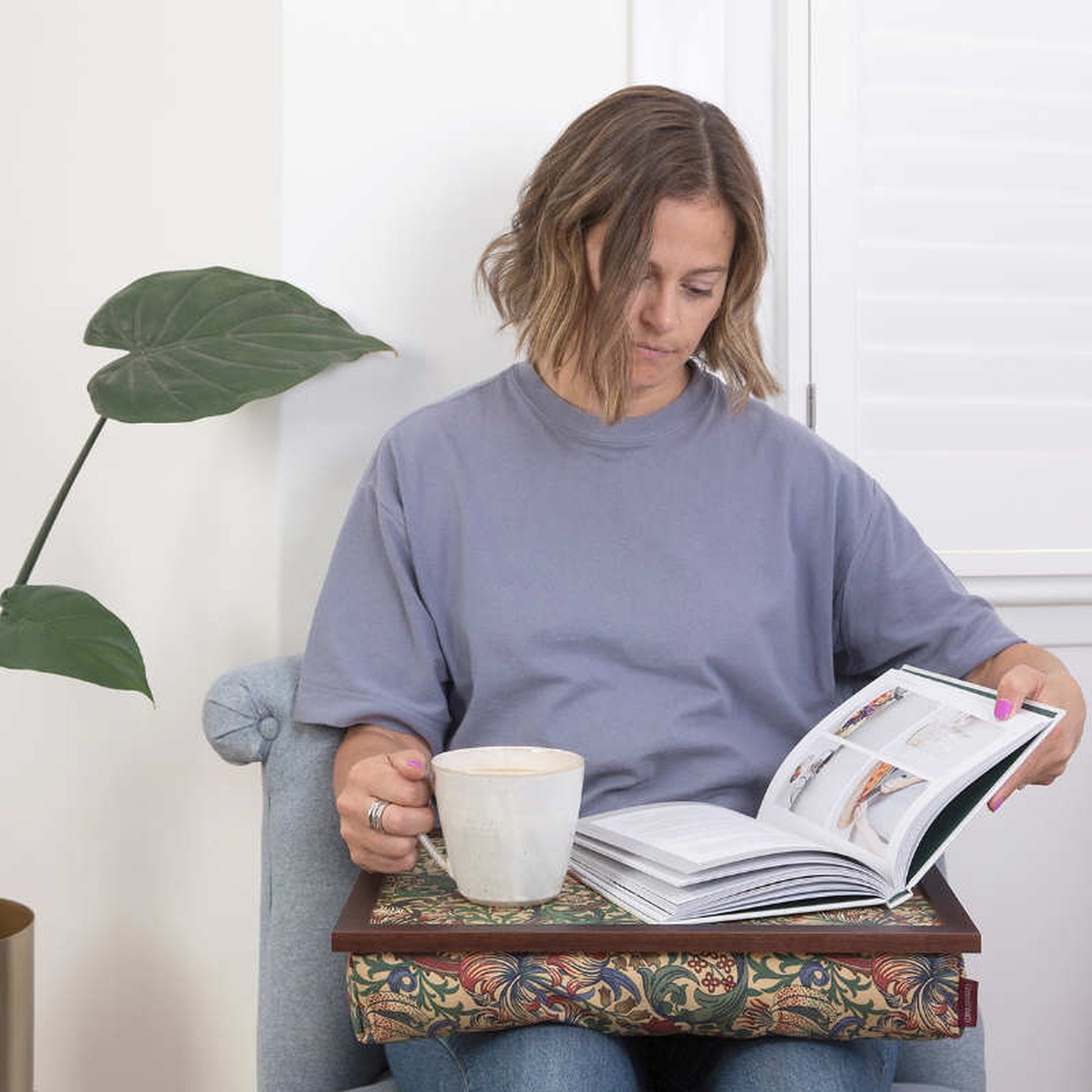 The Green and Heath Snakeshead lap tray makes working, playing or eating that little more comfortable, not to say stylish. Snakeshead was designed by William Morris in 1876, taking its name from the flowers dotted amongst its intricate textile pattern. The cleverly drawn shapes create a captivating three-dimensional effect as if the plants are blossoming from the cotton fabric. Generously filled with eco-friendly, anti-allergen British sheep's wool, the cushion is crafted to gently mould to your lap. The genuine wood frame of the Snakeshead lap tray prevents items from slipping off, while the top can be wiped clean. It's ideal for enjoying a relaxing weekend breakfast in bed or a Friday-night dinner in front of the TV.