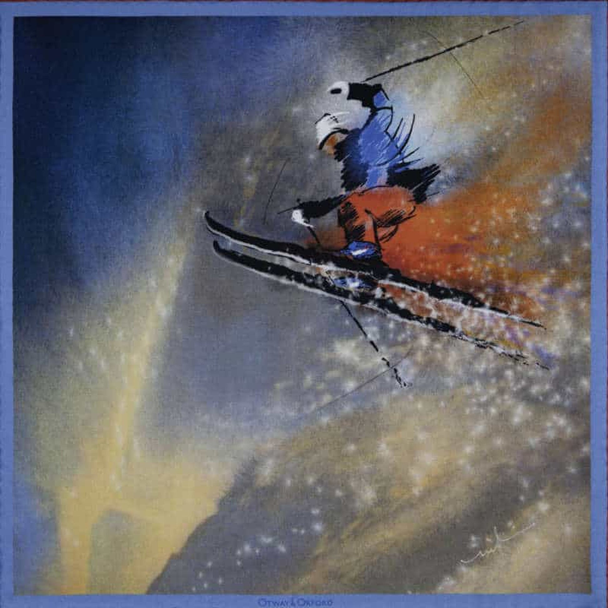 moment, as the skier launches himself into the air. The artwork is reproduced with a good balance of colour between the printed and reverse sides of the silk pocket square so works perfectly with any pocket square fold. The image is framed by the pocket square's blue border and red hand-rolled & hand-sewn hem.