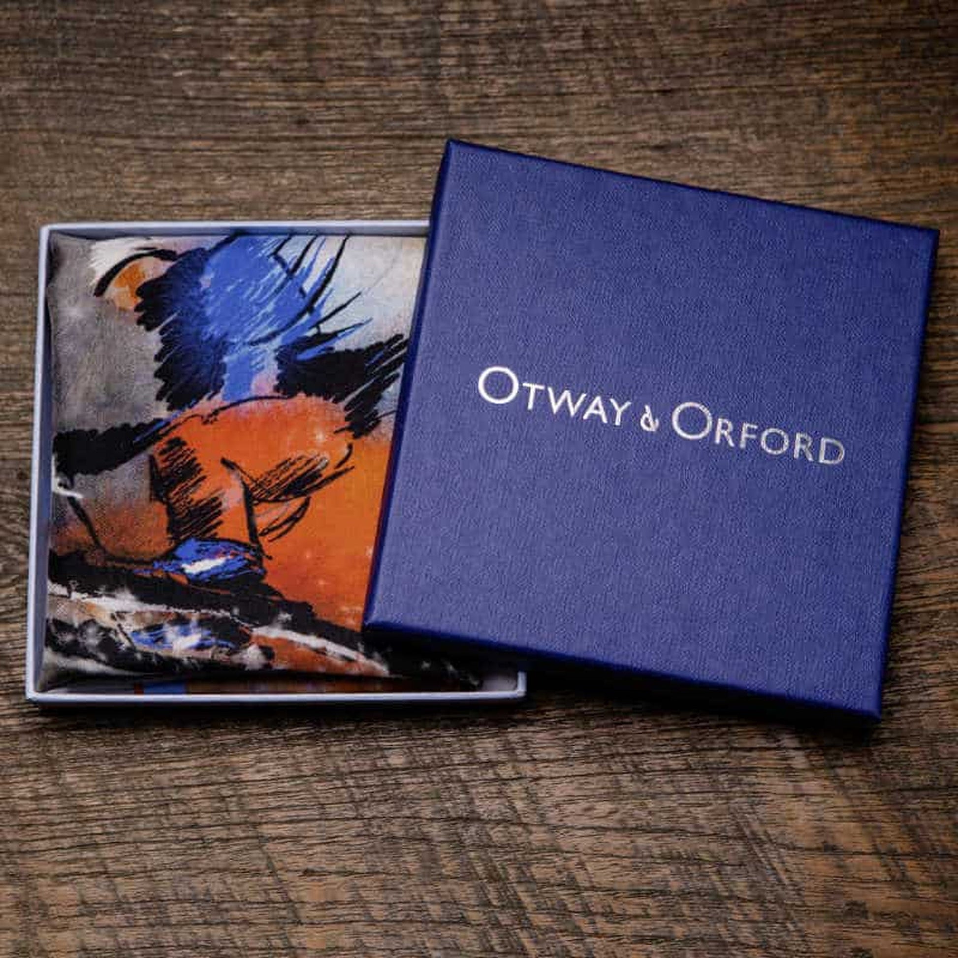 'The Jump' is presented in a complimentary Otway & Orford branded gift box with its blueberry-coloured lid and pale blue base. Inside each box, the high-quality skiing silk pocket square is tissue-wrapped and accompanied by a card telling the story of the artist and her vibrant artwork.
