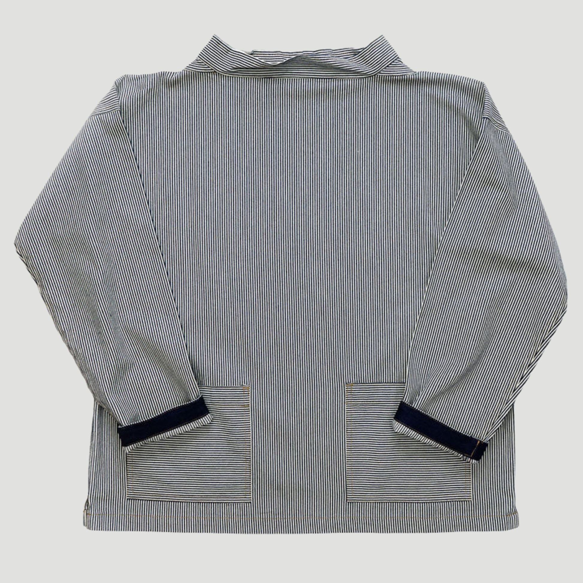 Traditional smock design in elegant ticking stripe, handcrafted in Great Yarmouth. A must-have for those who appreciate workwear with a twist.