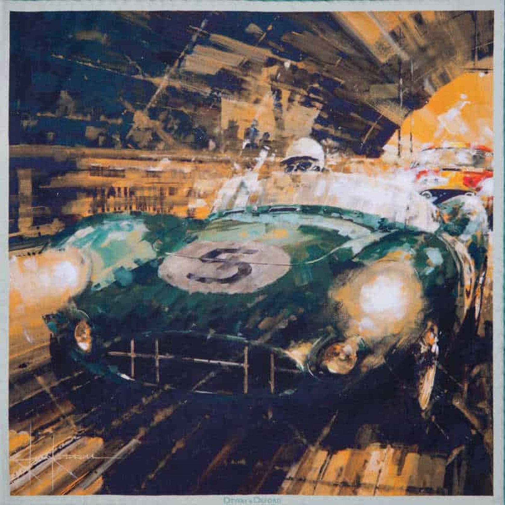 Victory At Last' is inspired by classic motor racing and is a high quality Aston Martin silk pocket square with hand-rolled and hand-sewn hem. It is made in Macclesfield the traditional home of English silk printing and presented in a complimentary gift box. It was created in collaboration with leading 'painter of speed' John Ketchell whose original acrylic on canvas work was inspired by the famous moment in motorsport history when Aston Martin won Le Mans outright in 1959. In the race, the DBR1 of Roy Salvadori and Carroll Shelby finally achieved victory for Aston Martin which had entered every Le Mans since 1931. John's semi-abstract impressionist style captures speed and drama at the same time as delivering accuracy of reproduction. The subject seems to burst into life.