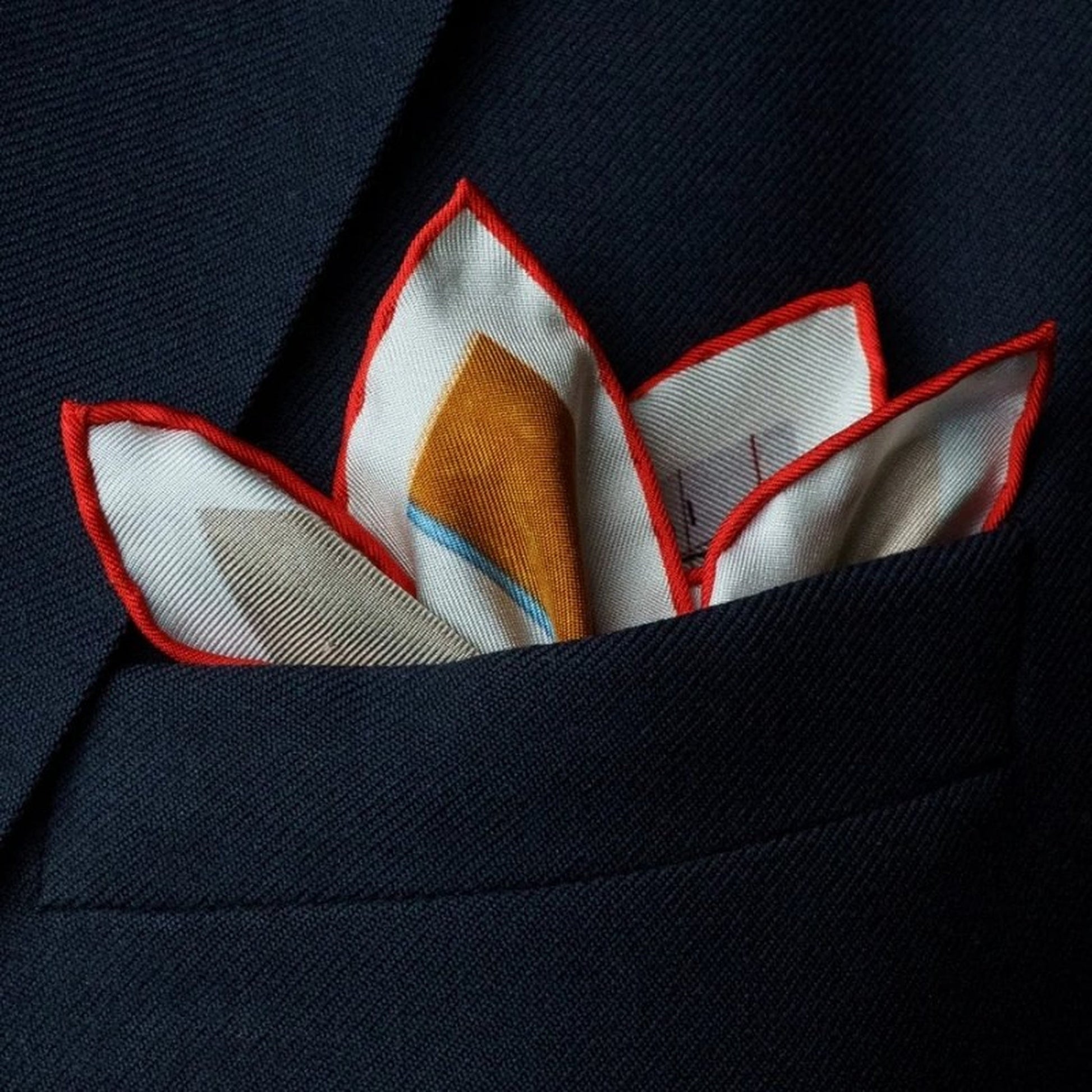 Vintage Velocity' is a unique and high-quality silk pocket square with hand-sewn hem, inspired by classic British motorcycles. It was created in collaboration with contemporary artist Chris White. Perfect for wearing to the Revival at Goodwood. Presented in a complimentary gift box. Made in England. Size 42cm x 42cm (16.5" x 16.5").