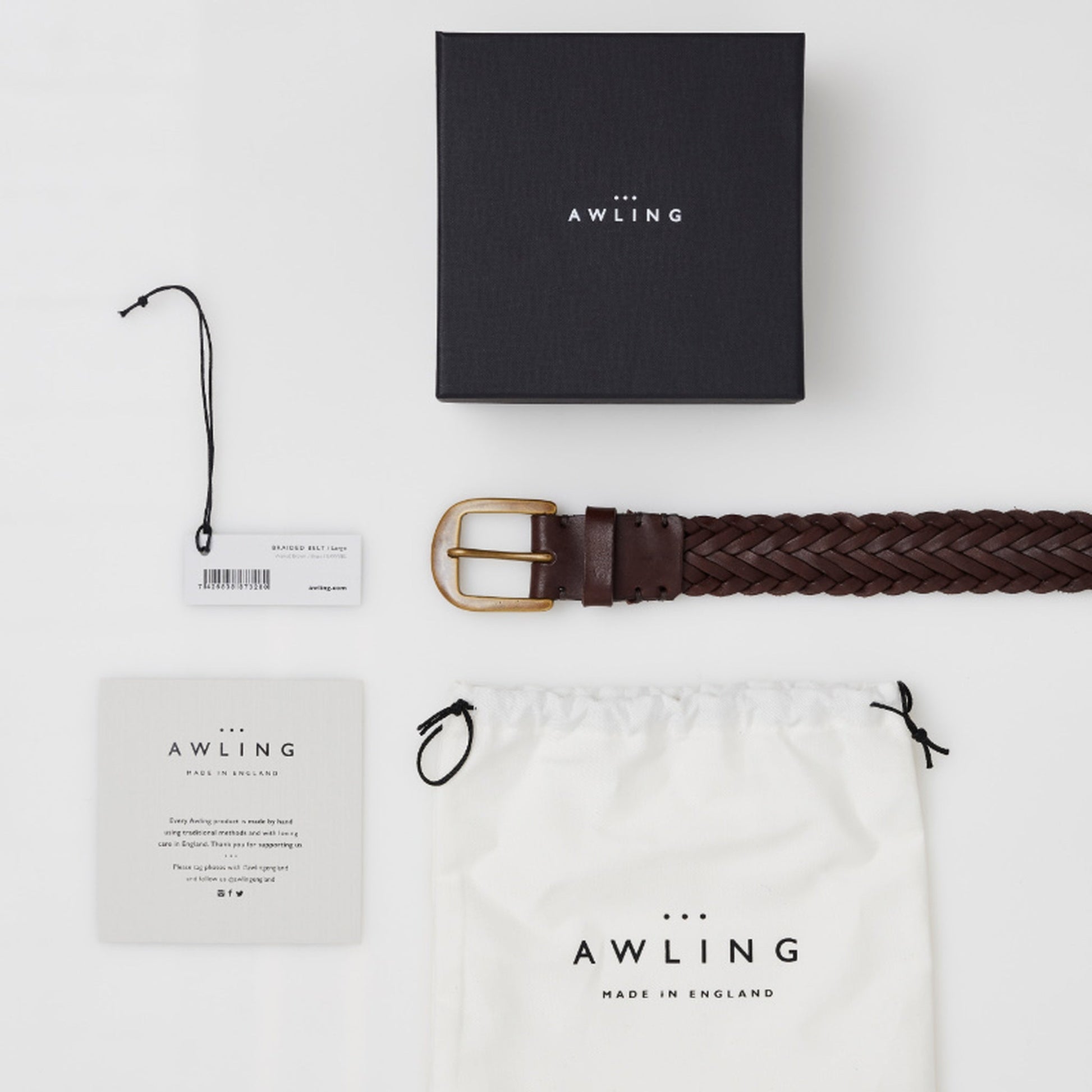 They say shoes make'th the man, but what's to be said about a belt? A belt keeps refinement in clothing and helps maintain class. Awling belts are handcrafted in England using the finest Italian vegetable, full grain leather. The Braided brown leather belt is deep and richly tanned, the brass buckle offers an eye-catching, elegant look. A blind, debossed Awling Belts Branding can be found on the rear of the belt, with a classic, single leather keep loop on the 32mm/11/4-inch strap all equals the splendid Walnut Brown leather belt for the modern man or woman to use and love. Every Awling belt is designed to last a lifetime, looking more rustic with every use. SIZING Size S covers 30" and 32" waist sizes - Size M covers 34" and 36" waist sizes Size L covers 38" and 40" waist sizes - Size XL covers 42" and 44" waist sizes Please note, Awling belts are sized accurately. If you are unsure of your size either measure an existing belt (from the point where the strap folds over the buckle to the hole you use most frequently) or measure your waist through the belt loops of jeans or trousers.