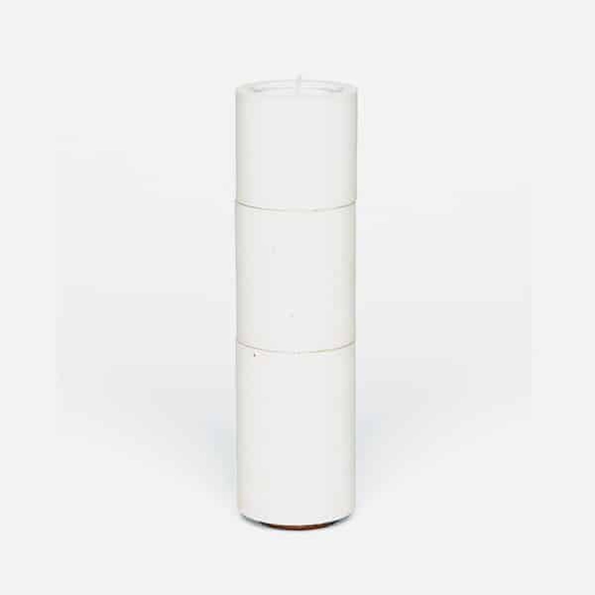 Make a statement with these hand poured, concrete white tea light holders. They make a wonderful centrepiece on a coffee table or side table. They have been purposely designed with a sustainable cork base so they look like they are floating on the surface. The cork base also means they can fit into the unique Concrete & Wax modular system. This clever system means that you can create a whole host of different stacks of candles and holders from any of the Concrete & Wax range. Standard sized tea lights fit into them perfectly for that welcoming glow on an evening that only a candle can offer. Each concrete holder is individually poured to create a unique and individual piece that gives each one its own character. Modern, minimalist yet soulful. Delivered with a set of 3 soy wax tealights in your selected fragrance. Handcrafted in Suffolk