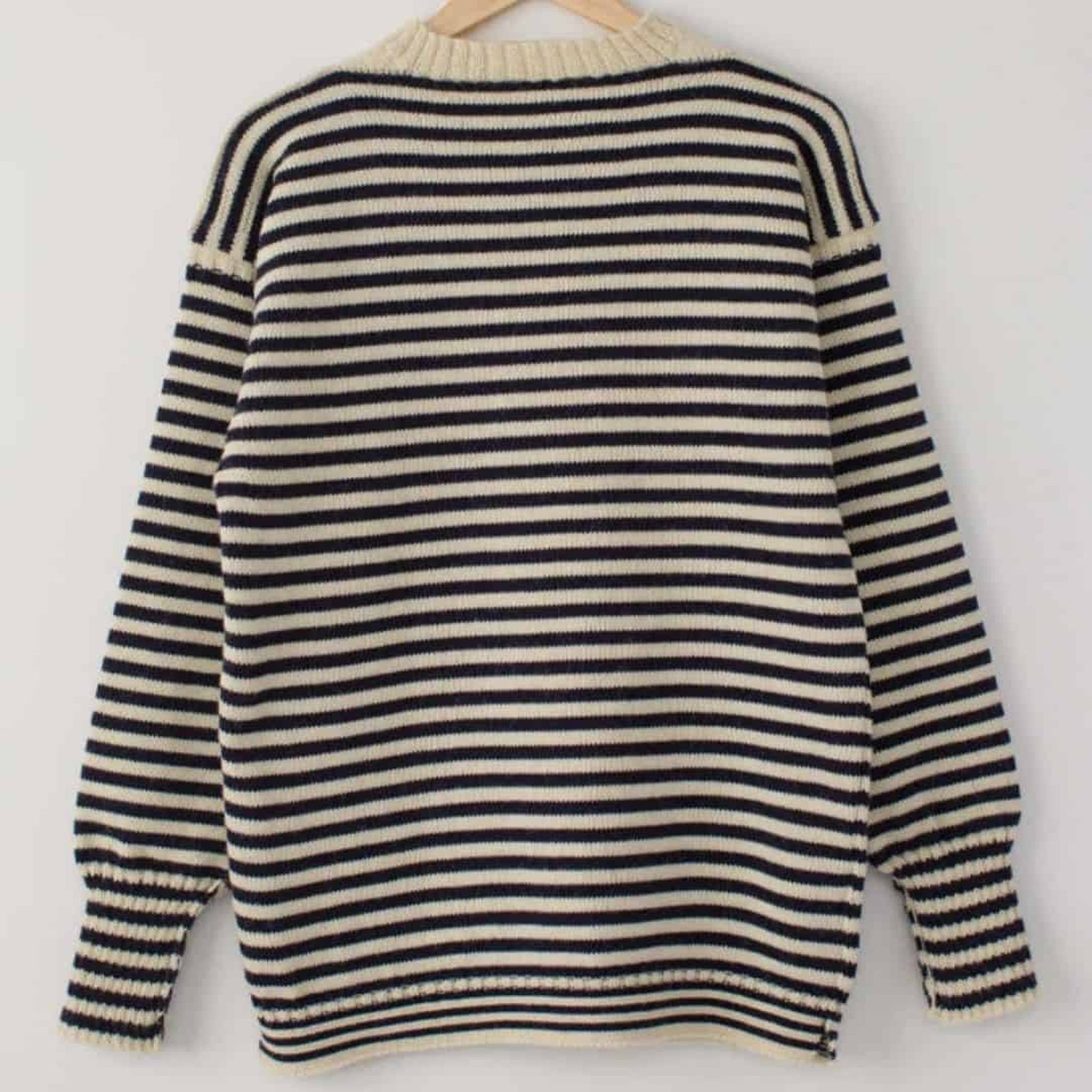 Cream and navy stripes celebrate British coastal knitting traditions. Perfect for anyone wanting elegant, practical jumpers with genuine seafaring heritage.