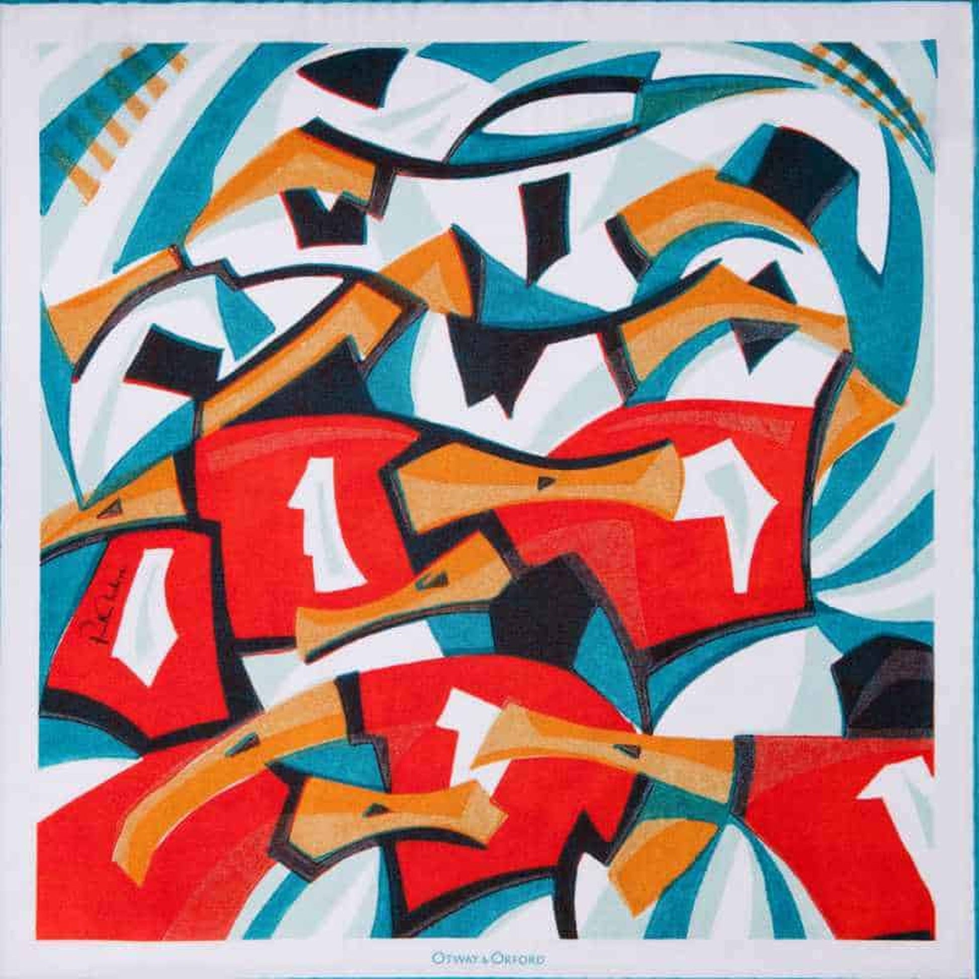 World Class Scrummage' is inspired by rugby and is a high quality, large-size silk pocket square with hand-rolled and hand-sewn hem. It is made in Macclesfield, the traditional home of English silk printing. It was created in collaboration with printmaker Paul Cleden, whose original linocut was printed using oil-based inks. The World Class Scrummage silk pocket square was inspired by his love of figurative movement in rugby. A homage to all its dynamic shapes and action. The work pits forwards against forwards in a titanic clash of White vs Red. Paul's linocut prints, with their bold overlapping colours and pared down shapes, take several months to produce. Each final print is hand-pulled by Paul using his 130-year-old printing press. 'World Class Scrummage' is reproduced with a good balance of colour between the printed and reverse side of the silk pocket square, which works perfectly with any pocket square fold. The artwork is framed by the pocket square's white border and turquoise hand-finished hem. The 'World Class Scrummage' silk pocket square makes an ideal gift for men who love their rugby. Whether watching an international match or the local rugby club. Inside each high-quality Otway & Orford branded gift box the pocket square has been carefully wrapped in tissue. Furthermore it is accompanied by a card telling the story of the artist and his artwork.